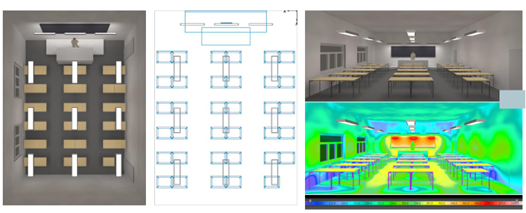 通過專業的軟件,我們做出來一套非常完整的布燈圖,這些布燈圖都是根據我司專用的LED護眼專用教室燈的產品才能達到如圖的效果