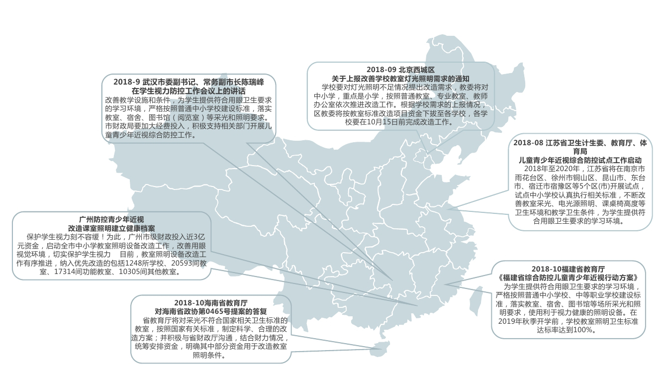 (3) 國家疾控中心調查發現,不良的教室照明環境是導致學生視力下降的主要因索,國家自然科學基金項目《基于光生物效應的教室健康照明研究》實驗中更科學地表明,學校教室照明將直接影晌學生學 效率及視力健康。